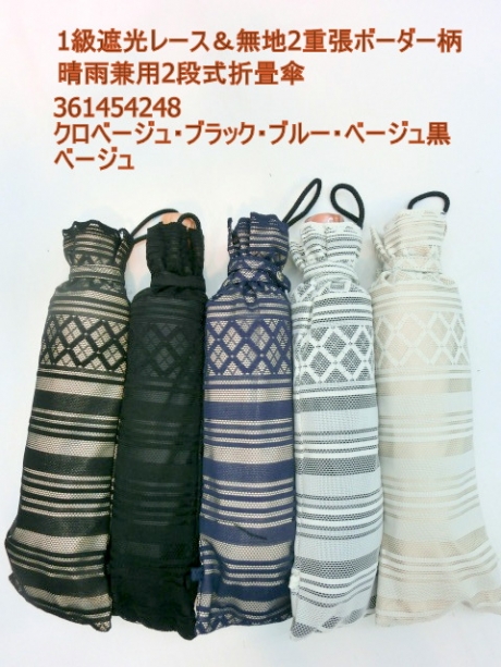 春夏新作)晴雨兼用・折畳傘-婦人 1級遮光レース&無地2重張ボーダー柄2段式折畳傘
