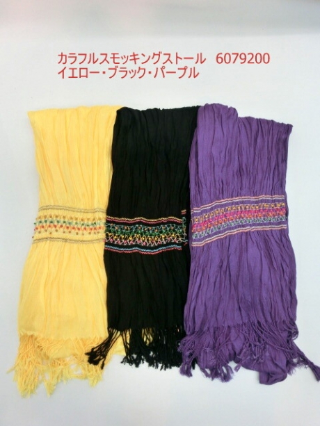 柔らかアクリル素材の無地生地に、豪華なカラフルスモッキング刺繍を施したストールです。