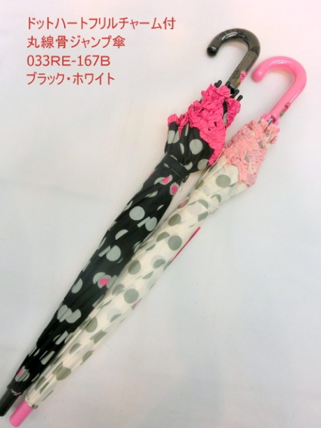 2019通年新作)雨傘・長傘−ジュニア ドットハートフリルチャーム付丸線骨ジャンプ傘