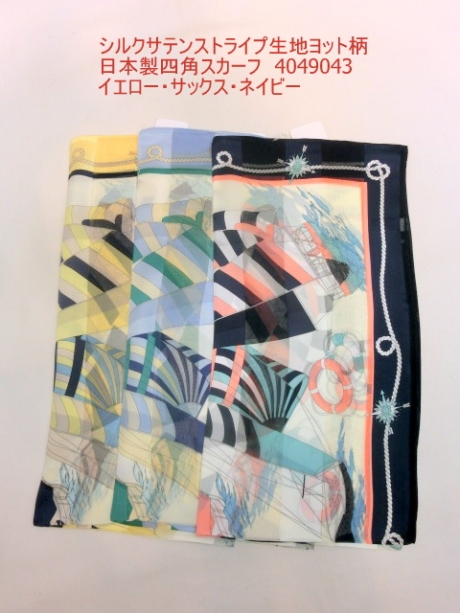 2019春夏新作)スカーフ シルクサテンストライプ生地ヨット柄日本製四角スカーフ