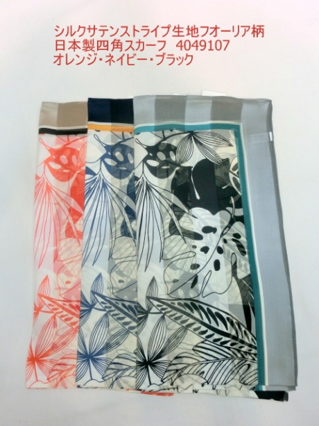 2019春夏新作)スカーフ シルクサテンストライプ生地フオーリア柄日本製四角スカーフ