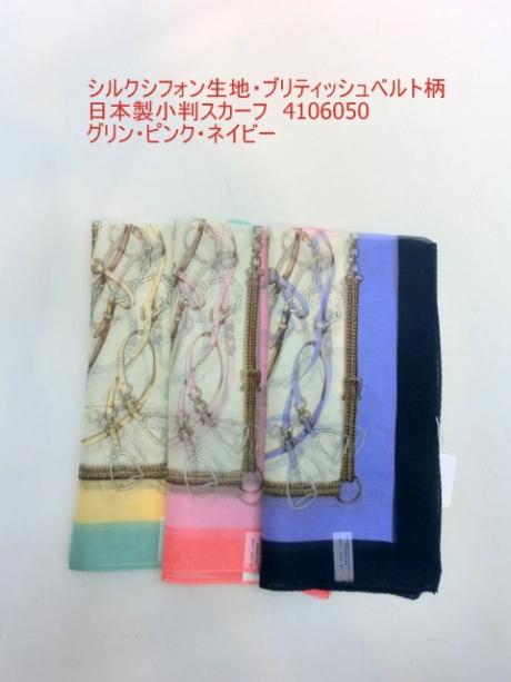 019春夏新作)スカーフ シルクシフォン生地・ブリティッシュベルト柄日本製小判スカーフ