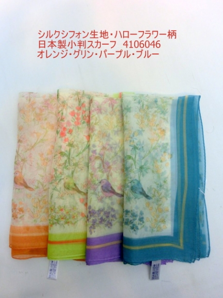 2019春夏新作)スカーフ シルクシフォン生地・ハローフラワー柄日本製小判スカーフ
